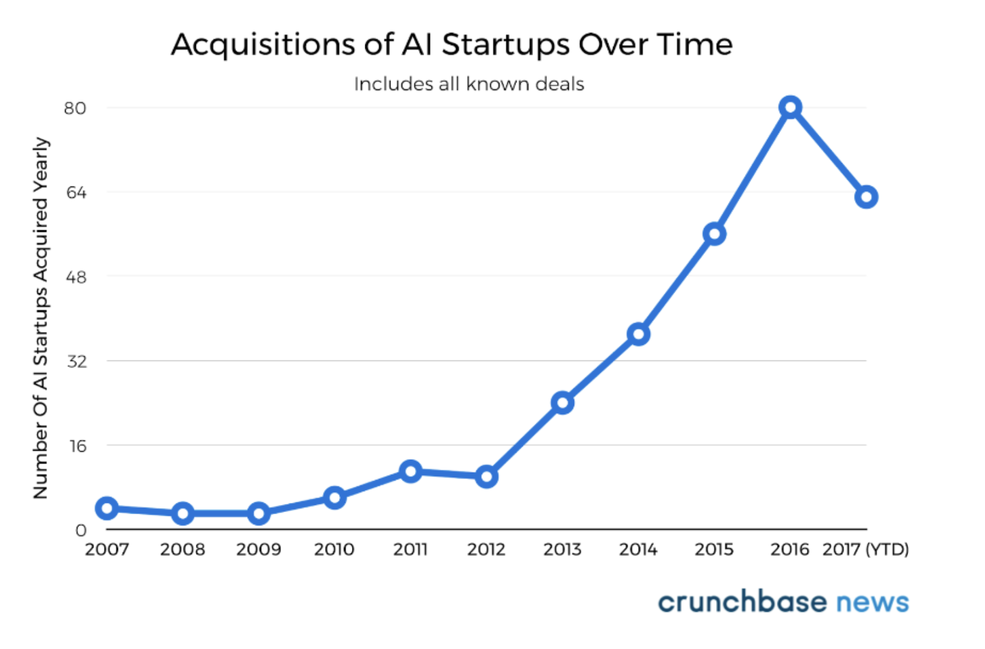 As I embarked on the journey of assuming my assistant professorship, the first wave of generative AI began to reshape the landscape. NeurIPS, the eminent gathering of AI enthusiasts, was expanding its realm to accommodate the surge of participants. Among them, pioneers and researchers exploring Generative AI were joined by a burgeoning influx of industrial stakeholders and sponsors, eager to showcase innovations and allure fresh talent. The year was 2016, and the echoes of that pivotal NeurIPS conference lingered. Days after departing the event, I found myself at a table with colleagues, each brimming with ideas for startups in the Generative AI domain. It was a time of boundless possibilities, much like the inception of Geometric Intelligence by some of our friends, which soon found a home under Uber's wing. Acquisitions were on the rise, researchers sought pathways to secure substantial backing from venture capitalists that would pave the path to even more capital from an acquirer. The graph below, depicting the trajectory of AI company acquisitions until mid-2017, captured the spirit of the time: "AI Startups Take The Money And Run As Big Tech Comes Acquiring."
