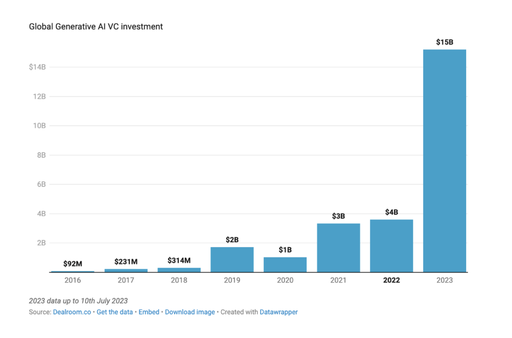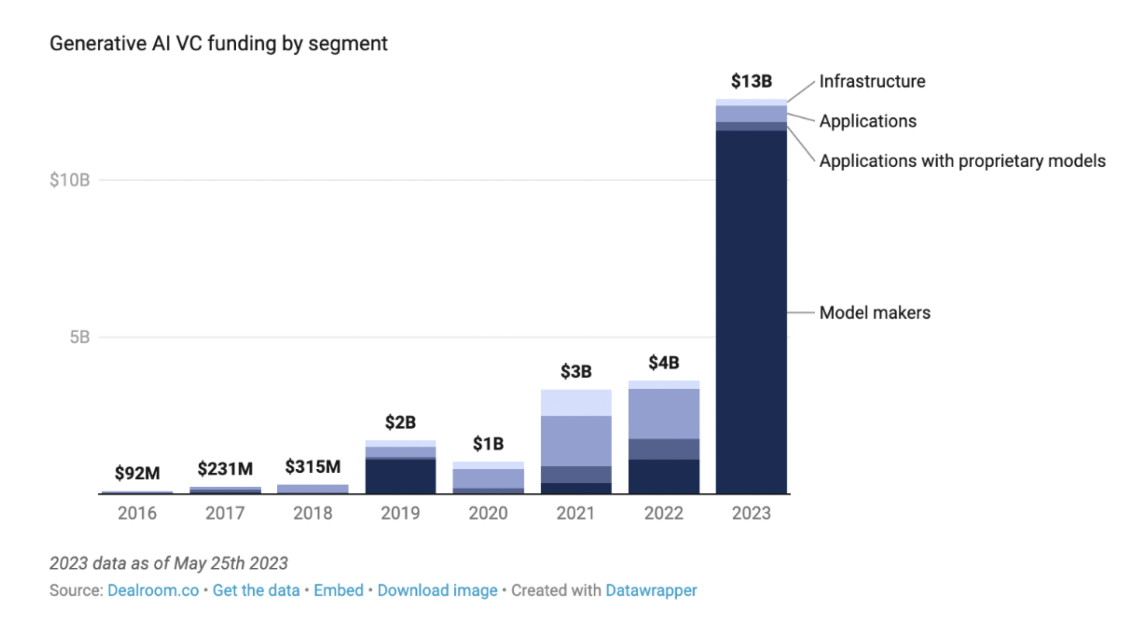 Surveying the present landscape, I'm struck by the resonance between then and now, as history seemingly replays its course. Lessons from the first wave of Generative AI hold a mirror to our contemporary endeavours, illuminating paths to navigate and reshape the innovation trajectory. The strides taken in advancing generative AI over the past seven years have been monumental. Large language models (LLMs) have redefined not just the tasks computers undertake, but, crucially, the very essence of human-computer interaction. The shift from encoding queries with specific keywords to embracing natural dialogues marks a pivotal leap, though it's but the first step on a transformative journey on an industrial scale. In a world inundated with news and blogs heralding AI's transformative potential, a remarkable influx of capital flushes into the sector. This year alone, an astonishing $15 billion has flowed in, dwarfing the $4 billion of the preceding year. Keep in mind that this data is skewed by a few colossal deals, such as OpenAI’s significant capital injection.