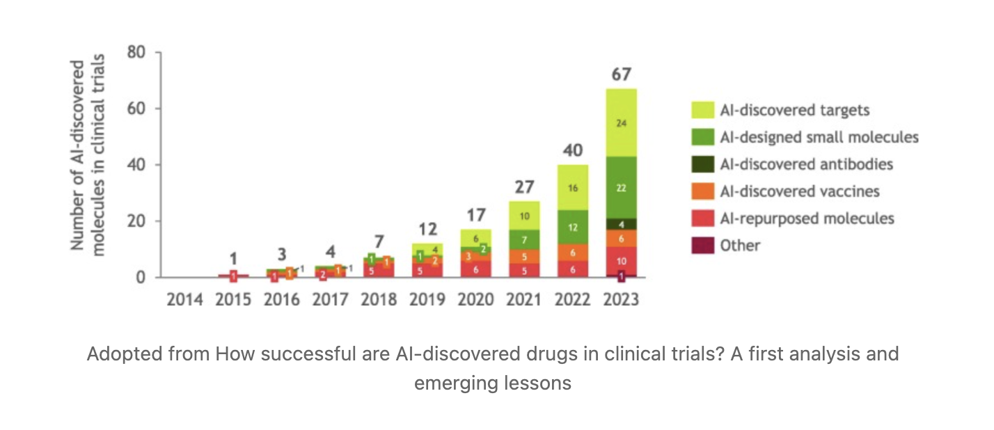 I launched my first venture in 2017 when the field seemed poised for transformation. By 2020, the first AI-designed drug candidates entered clinical trials, and by early 2024, 75 clinical assets, where AI played some role, were reported in various clinical trial phases, with the most advanced now in Phase II. While still too early for conclusive judgment (given the notorious "death valley"), these achievements represent a pivotal industry shift in both productivity and efficiency.